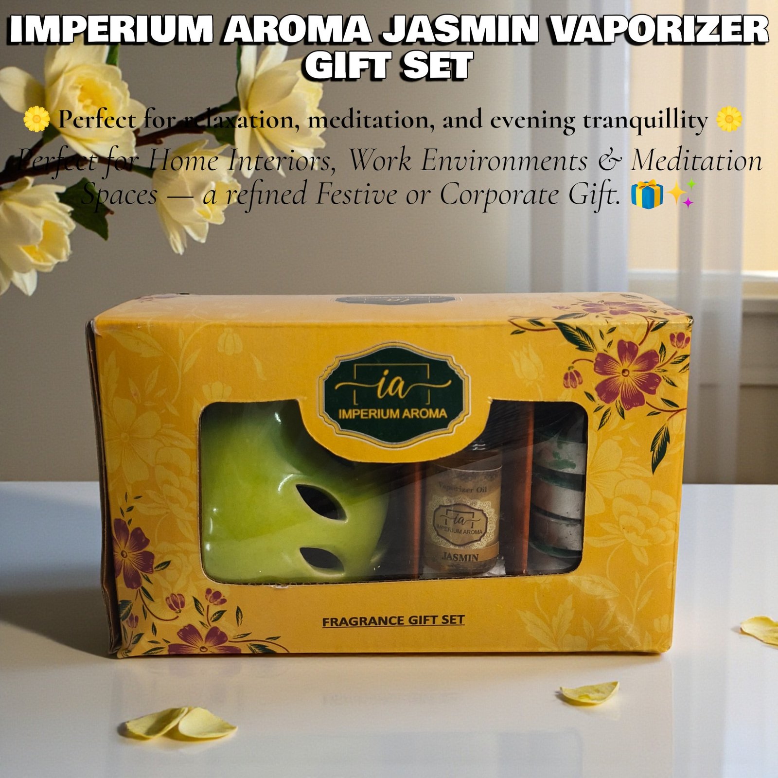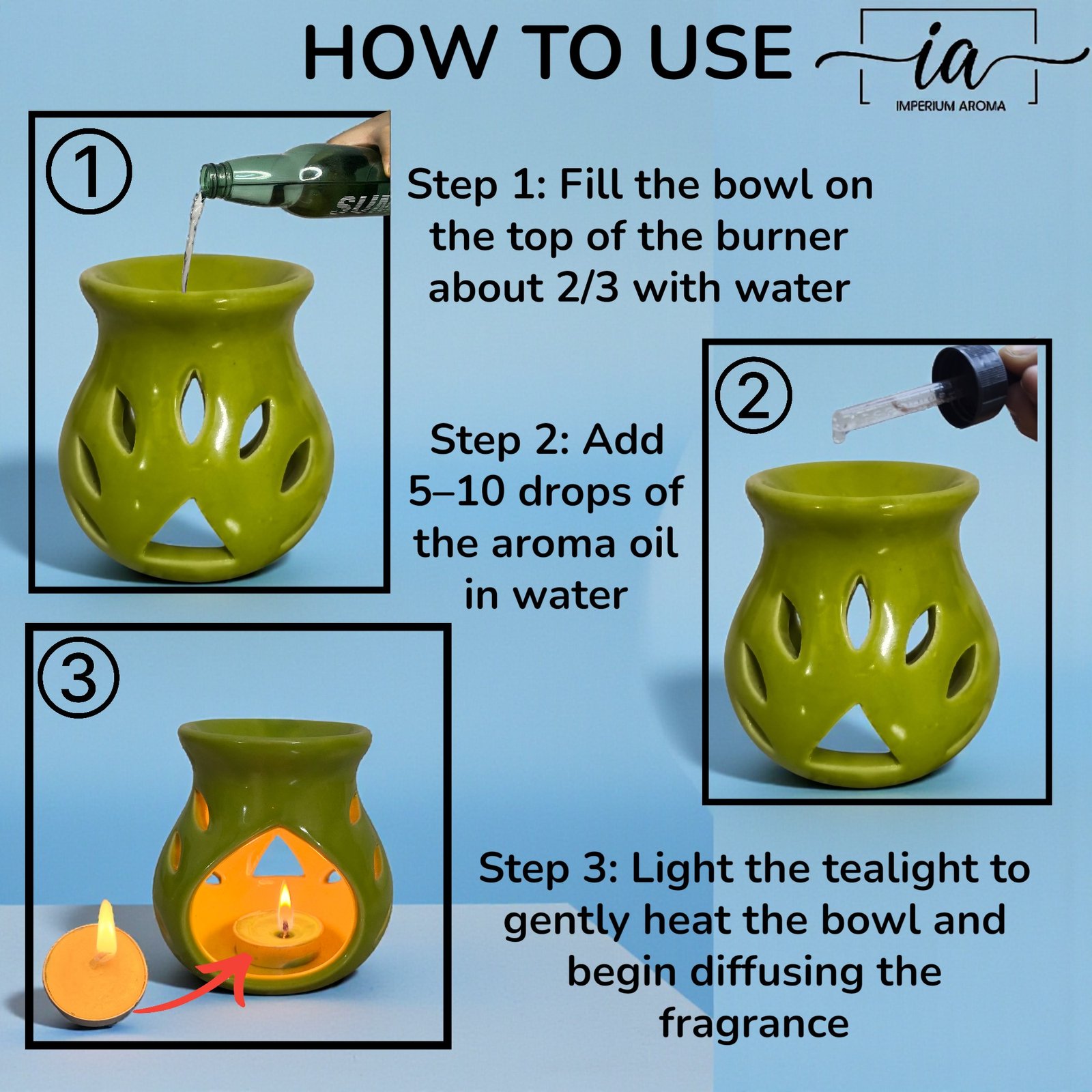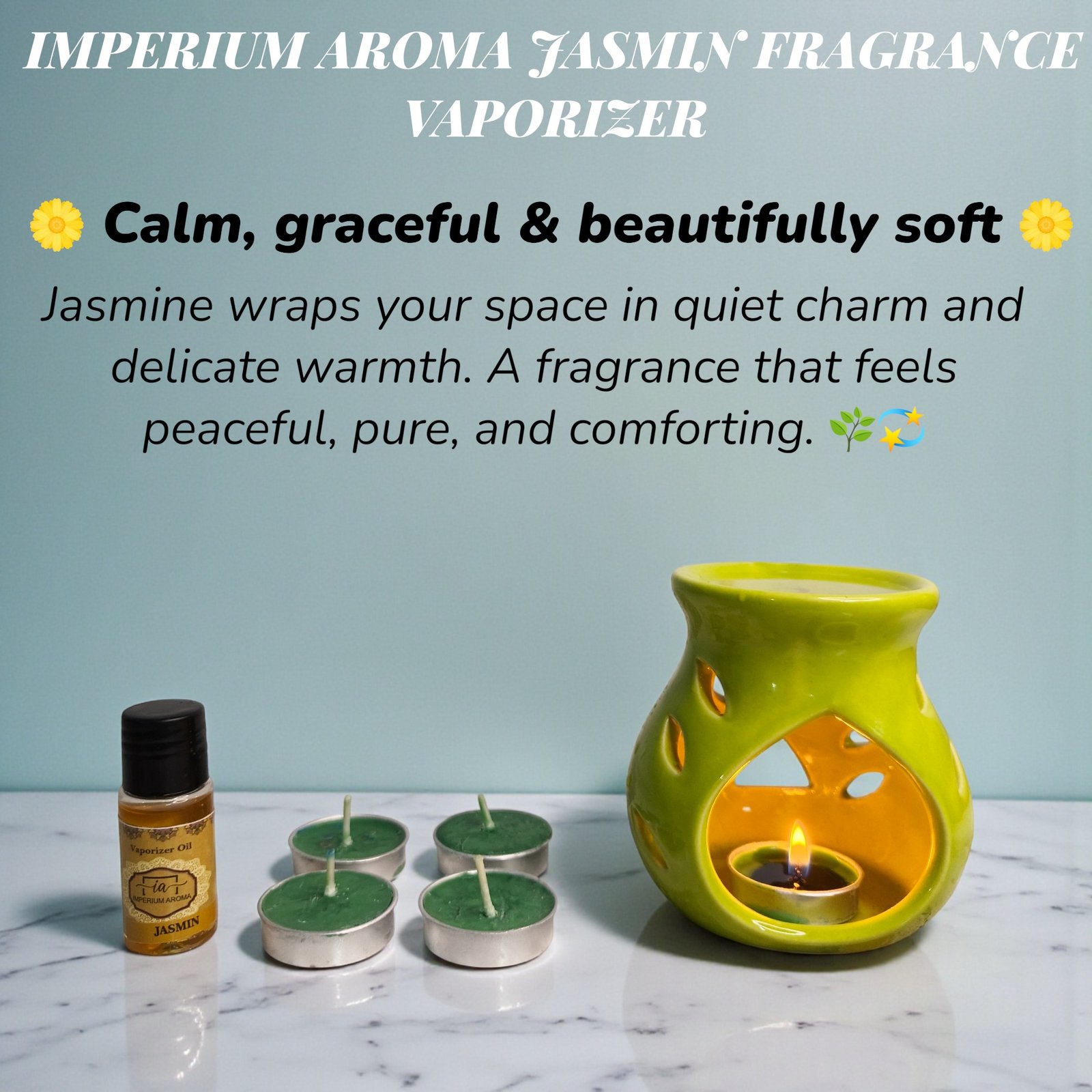- The Imperium Vaporizer uses gentle heat diffusion to fill your space with calming jasmine aroma. Just add water and a few drops of fragrance oil to the ceramic bowl, place a tealight below. As the mixture gently heats, a soft floral mist relaxes your senses. When the water and oil blend evaporate, simply refill to continue enjoying the serene ambiance.