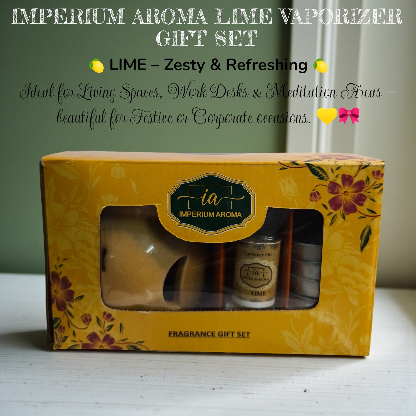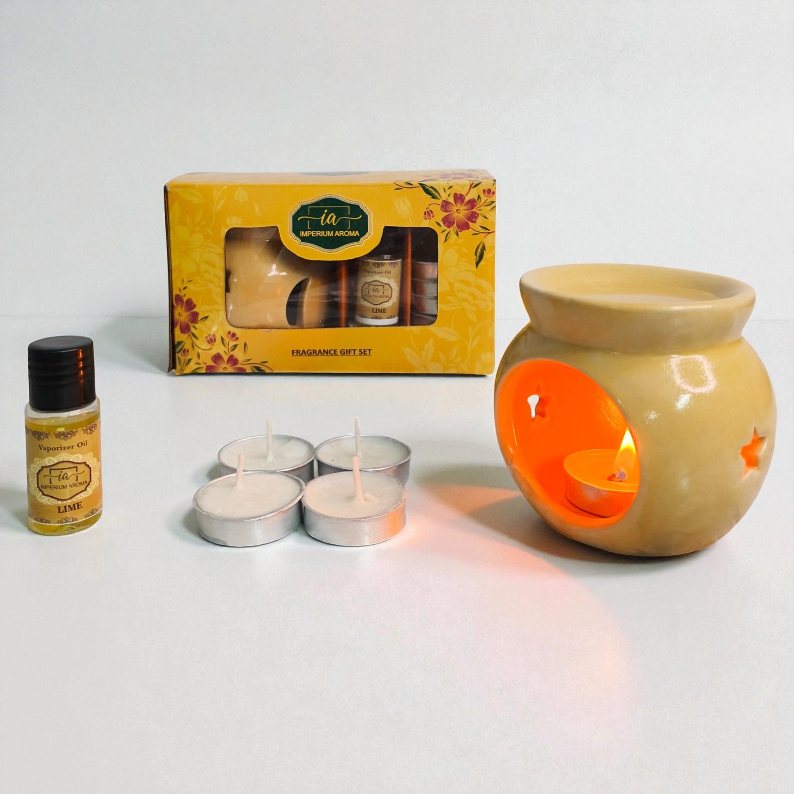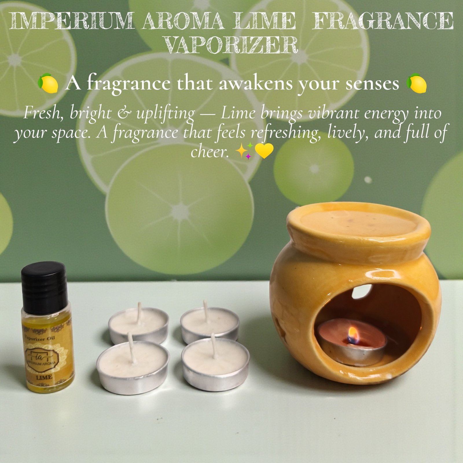 .Complete Aromatherapy Kit: Includes ceramic pot 15ml Lime oil, and 4 tealights for ready-to-use home fragrance.