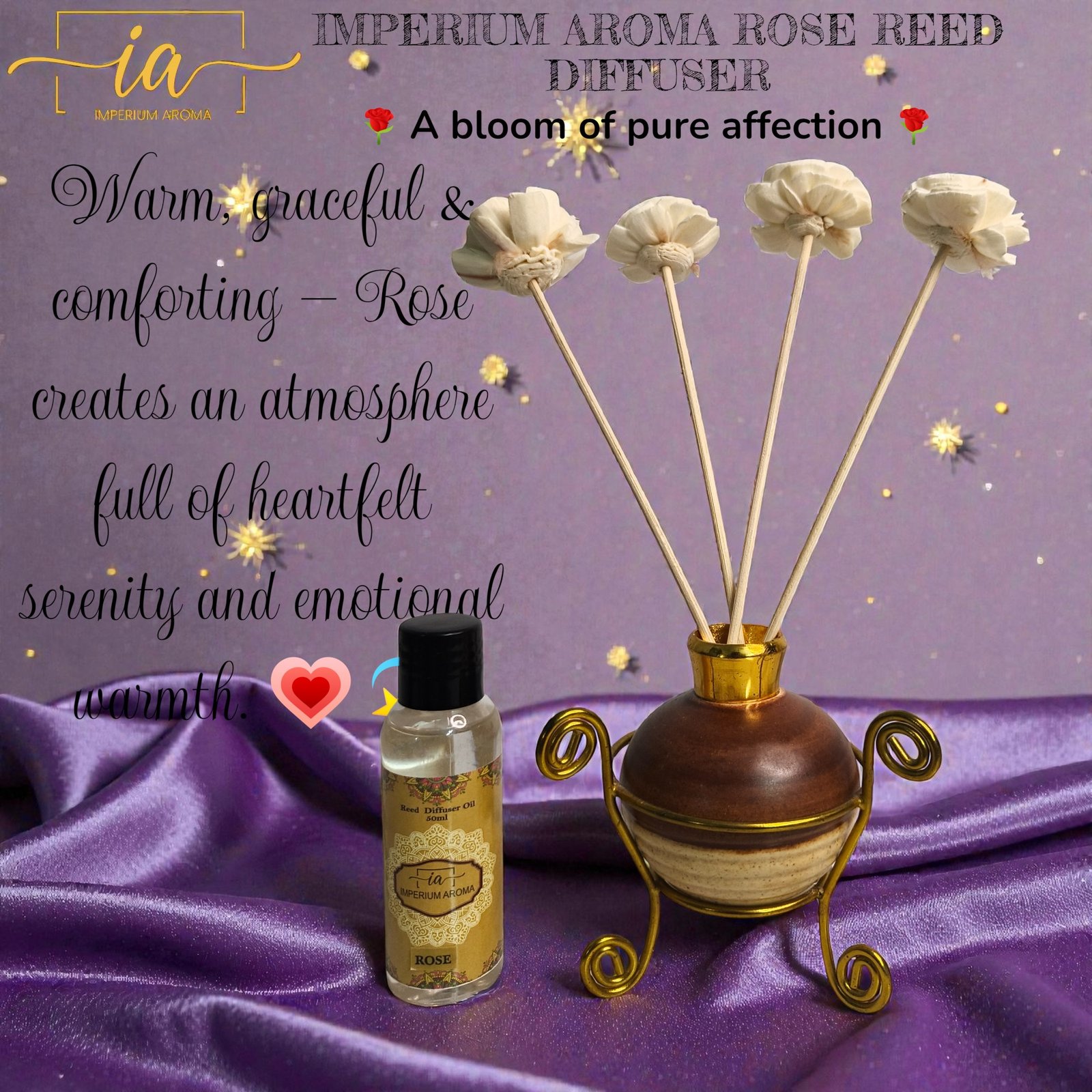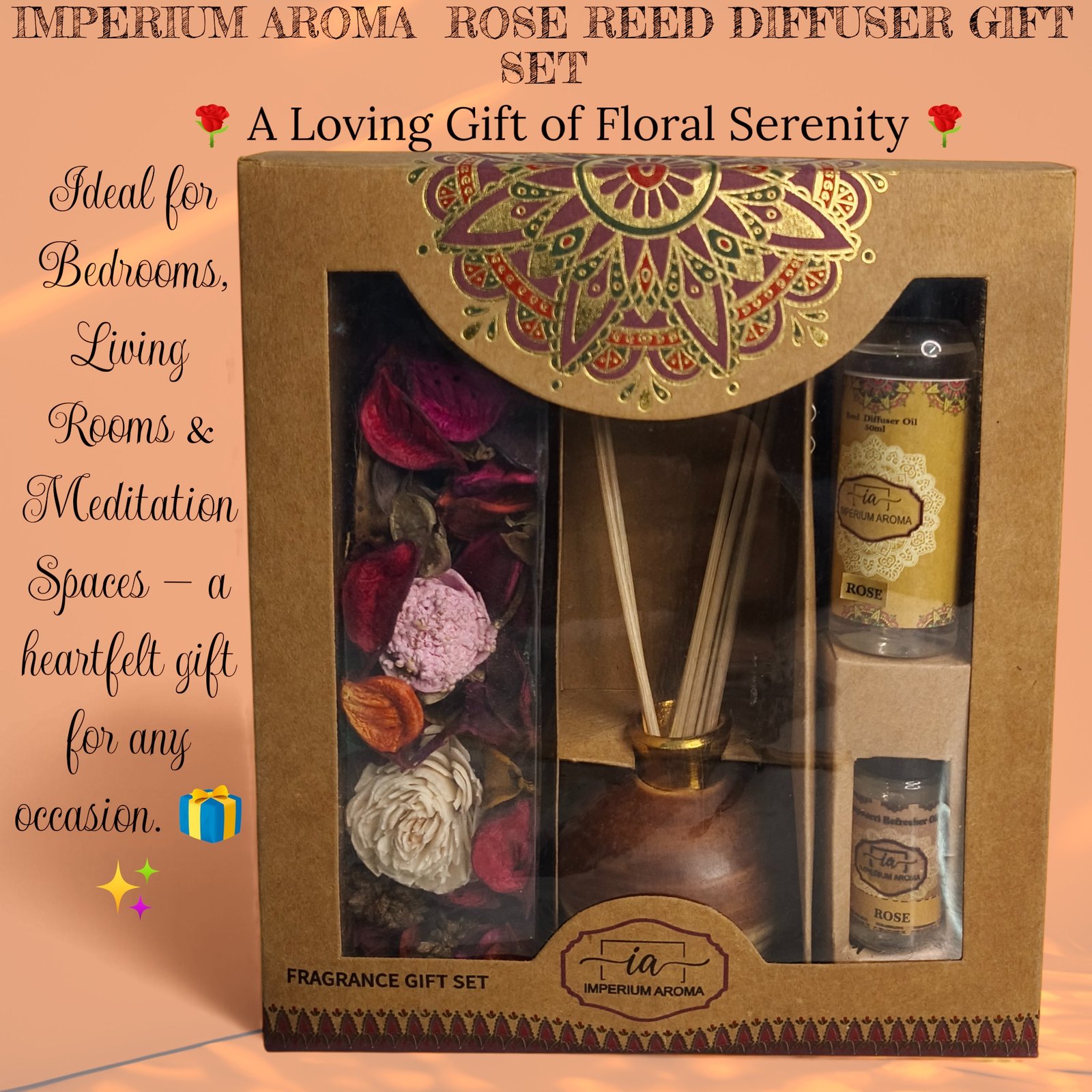 Indulge in the timeless romance of the Imperium Reed Diffuser. From the Imperium Aroma luxury collection, the Rose Reed Diffuser fills your space with the soft, graceful scent of freshly bloomed roses. A symbol of elegance and quiet luxury, it suits both modern and classic interiors.