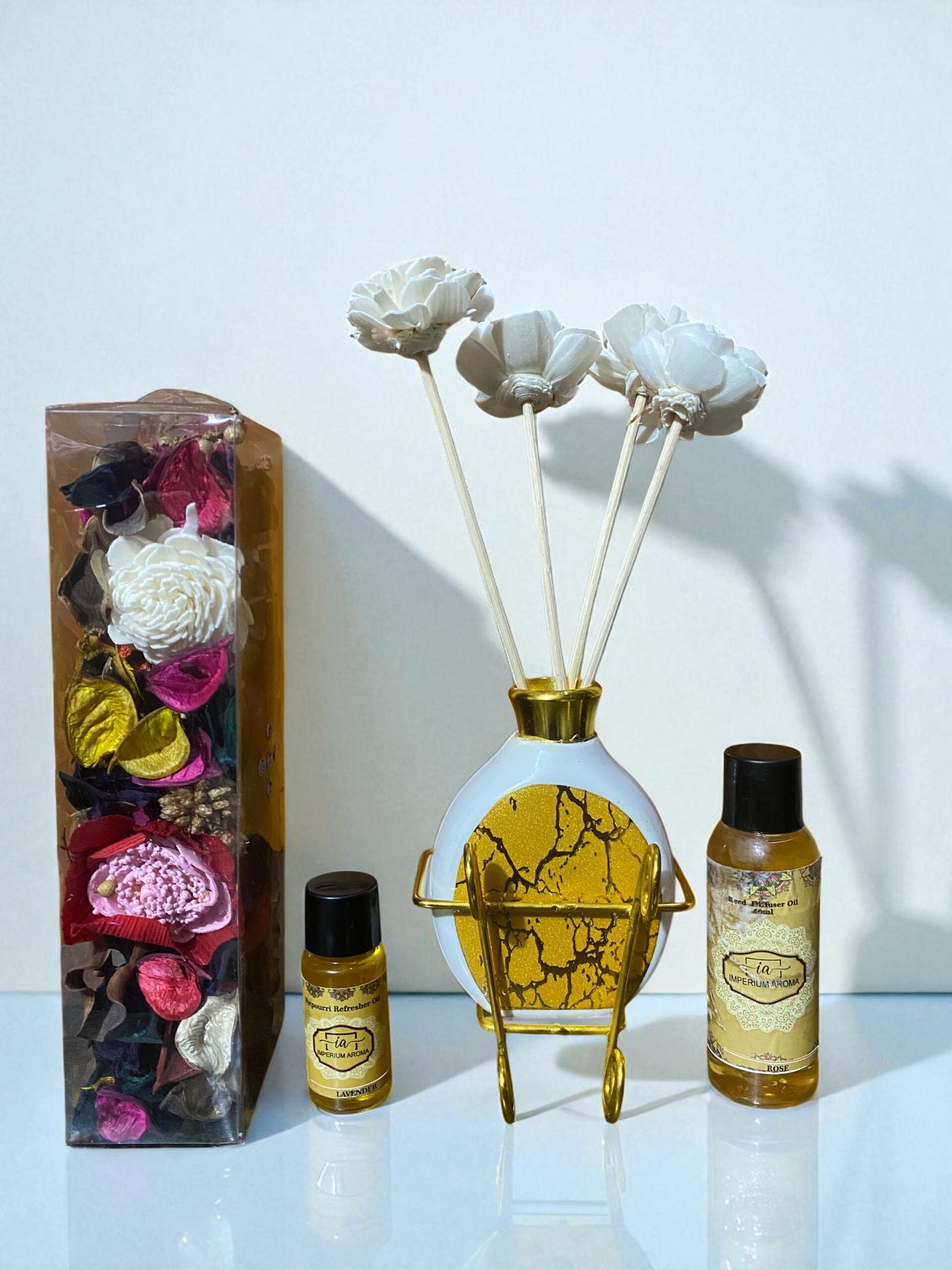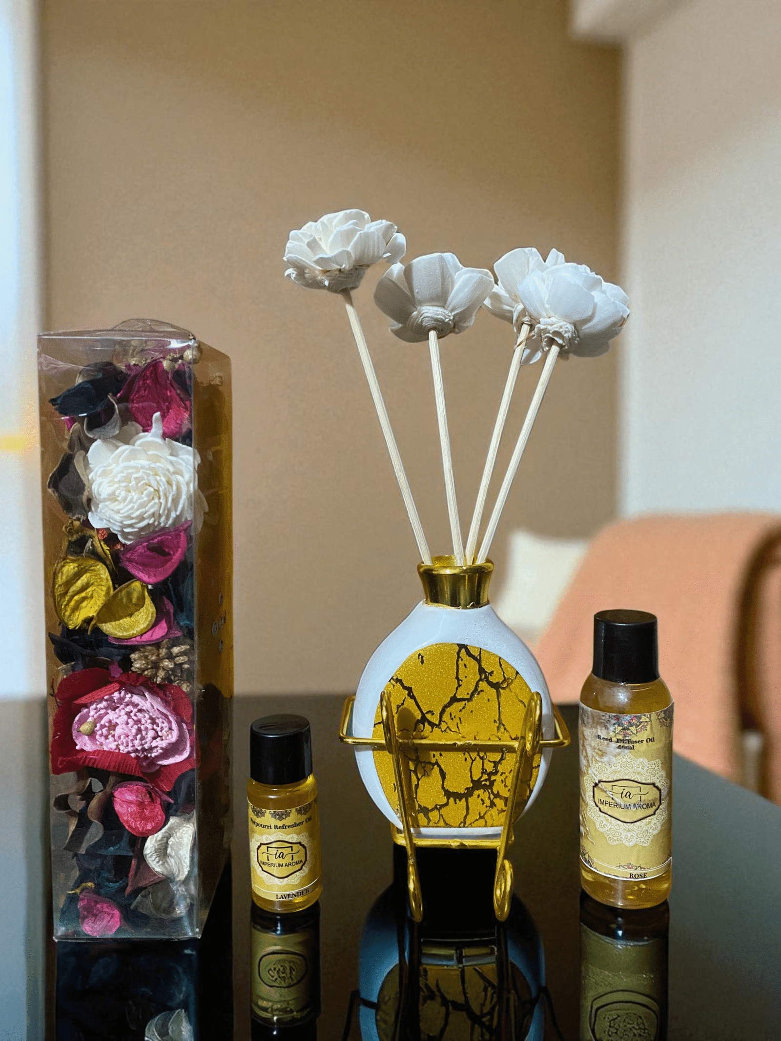 From the Imperium Aroma luxury collection, the Rose Reed Diffuser fills your space with the soft, graceful scent of freshly bloomed roses. A symbol of elegance and quiet luxury, it suits both modern and classic interiors.