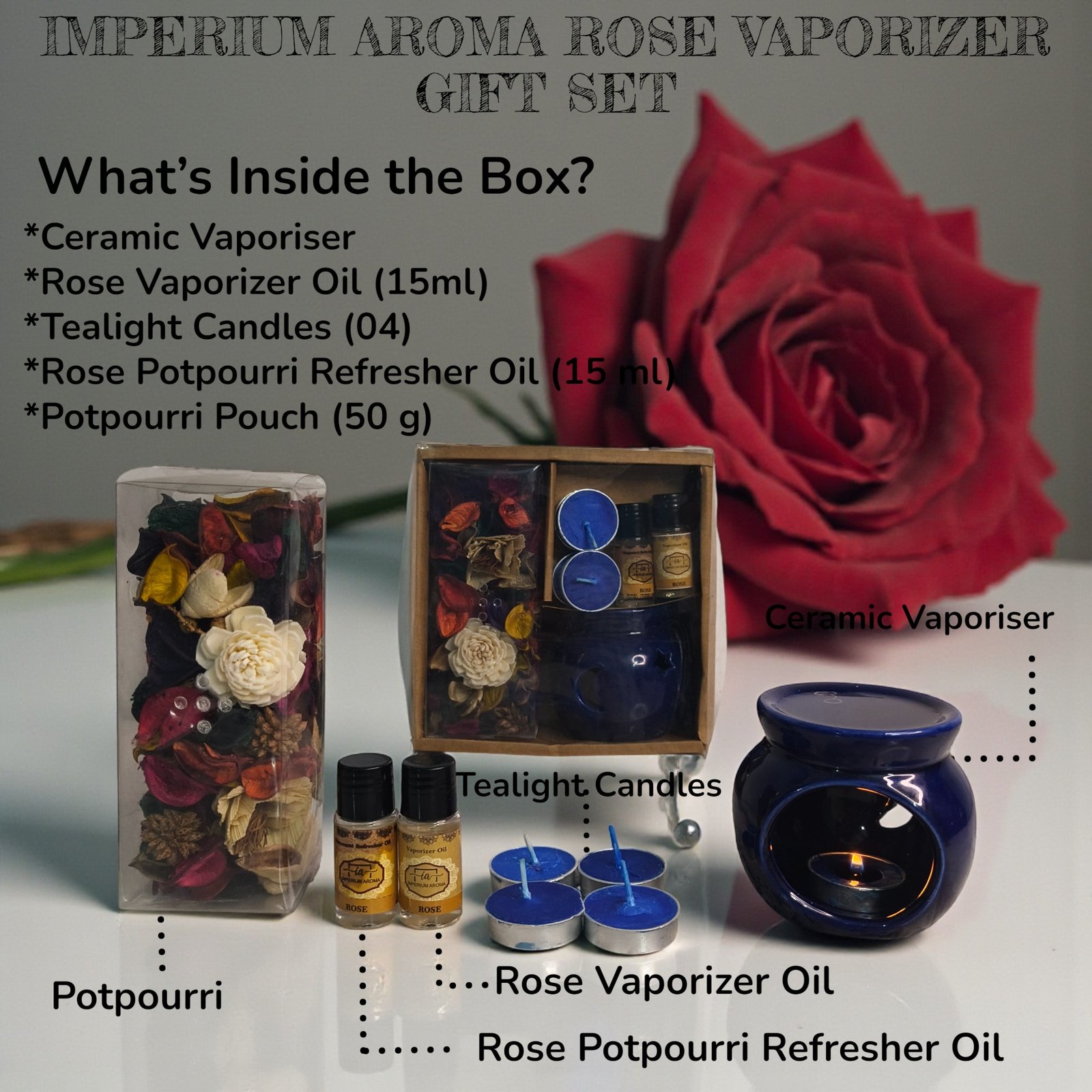 Complete Gift Set: Includes ceramic burner, 15ml Rose vaporizer oil, 15ml Tropical Sunset refresher oil, 50g potpourri, and 4 tealight candles.