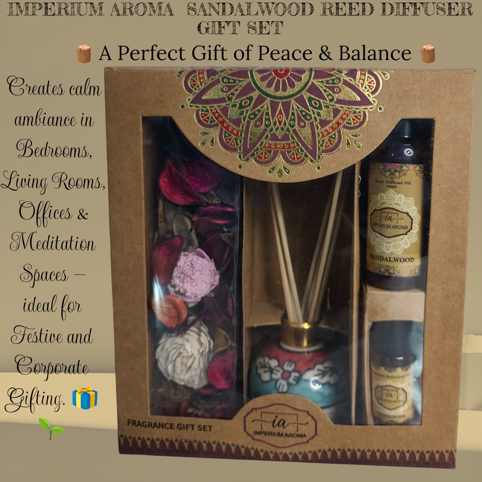 Immerse yourself in the warm, grounding aroma of the Imperium Sandalwood Reed Diffuser. Its rich, earthy notes create a serene, elegant atmosphere that soothes the senses.